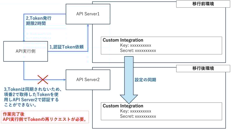 本作業実施に伴いAPI認証サーバが切り替わり、作業後の問い合わせは新サーバに対して実施されるためです。